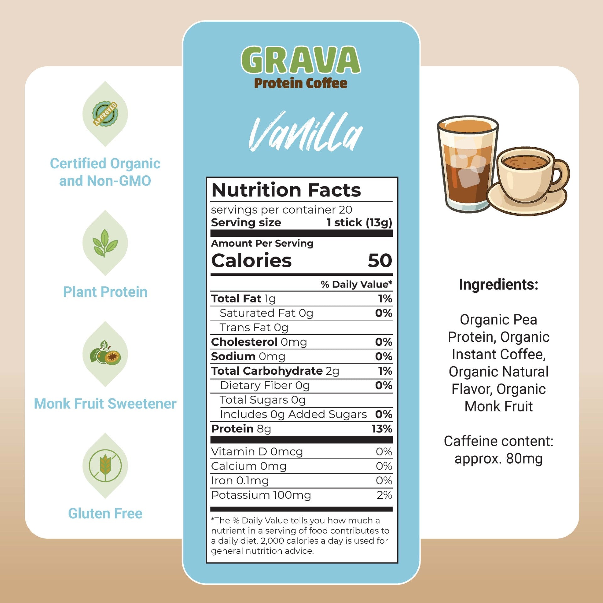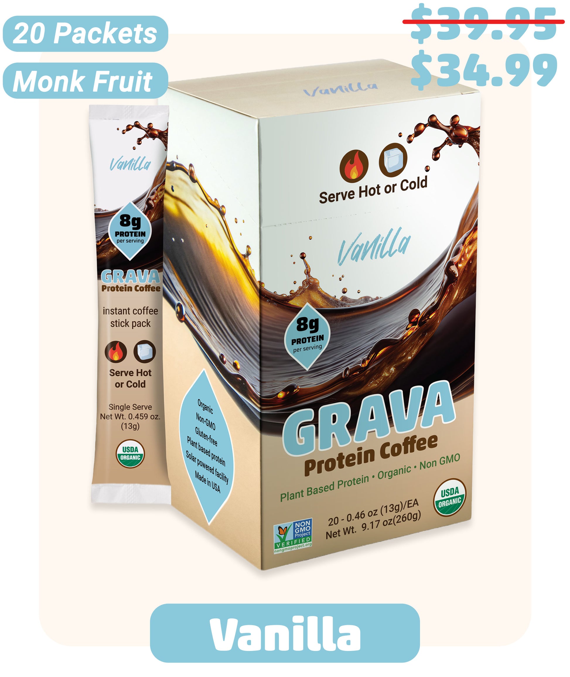 Elevate your morning coffee routine with this innovative vanilla-flavored protein coffee blend. Each convenient single-serve stick pack delivers a perfect combination of organic coffee and plant-based protein, naturally sweetened with monk fruit for a delicious zero-sugar experience. The 20-count box provides enough servings to power through nearly a month of energizing mornings. Perfect for busy professionals, fitness enthusiasts, or anyone seeking a protein-rich coffee alternative without the added sugars. Simply mix with hot or cold water or milk for an instant protein-packed coffee that doesn't compromise on taste. The single-serve format makes it ideal for travel, office, or on-the-go lifestyle, ensuring you never have to choose between your protein supplement and morning coffee again.